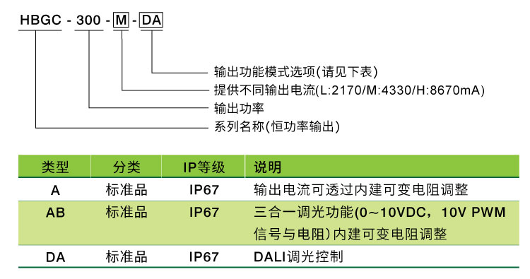 HBGC-300系列延续HBG系列外壳,采圆形铁壳设计,设计线路方面亦使用最新恒功率(Constant Power Mode)设计,让使用者更加容易调整所需的驱动电流,增加设计的便利性及减少整体机型数量,易于规划整体库存。此外,HBGC-300系列也提供各式调光功能,如三合一调光/DALI 2功能,并符合最新IEC61347/ UL8750及GB7000.1设计要求,输出及调光线间采隔离设计,提升灯具使用的安全性。