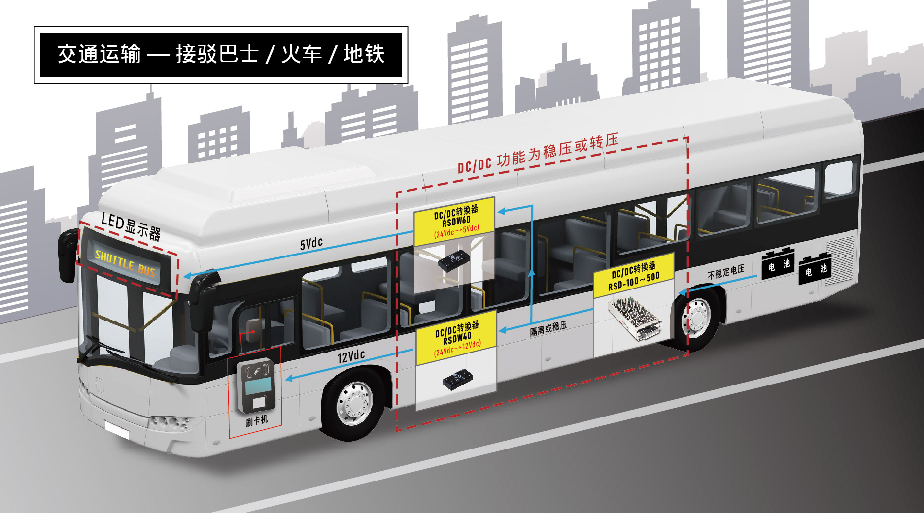 明纬继推出8W/10W/20W灌胶模块型铁道交通运输专用DC/DC转换器后,紧接着新推出了40W/60W更高瓦数的单组输出RSDW40/60及双组输出的RDDW40/60系列,可充分满足交通车载系统更高瓦数插板式DC/DC转换器之需求。