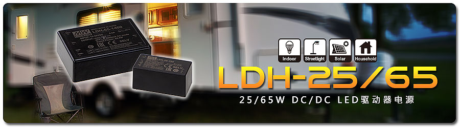 LDH-25/65W 为升压(Step up)式设计可配合二次电池供电使用,将输入电压12V或24V DC升压后提供给各种LED照明灯具做应用,同时也提供0-10V及PWM 调光功能。客户可搭配一般室内调光器或可搭配智能无线调光控制做使用,每一种瓦数亦提供多种输出电流供客户选用,目前LDH-25可提供250/ 350/500及700 mA驱动电流,LDH-65可提供700/1050/1400及1750 m A输出电流做使用,可满足大部分太阳能路灯及室内照明应用方式。