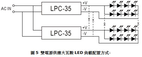 明纬LED power supply 并无并联功能,不可做并联使用,如有大瓦数需求,建议选择足够瓦数的电源供应器或将LED分割成几个区块各别供应电源,LED布局上也要依图(5)所示,将各别电源供应器的输出地回路分开。相反地,小瓦数的LED灯串则可并接后再由一较大额定的LED电源供应器来驱动(如图5所示),但须考虑其均流性。