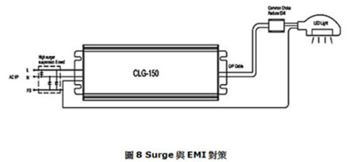 明纬LED电源供应器产品线中,雷击突波耐受能力最高的为XLG系列选配产品,可达10KV/Line-Line 6KV/Line-Earth等级,如需更高的SURGE耐受需如图(8)所示,再外接ZNR(470V)或Gas Tube(500V)对策,但需考虑整体安规要求。于多盏灯具应用时,为符合法规上需求可加装雷击电压保护器(SPD: Surge Protection Device)。